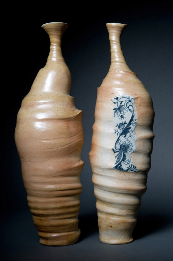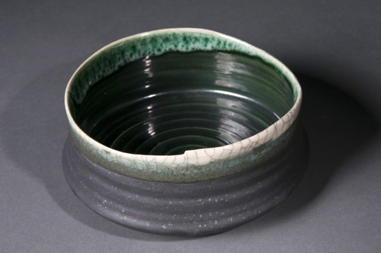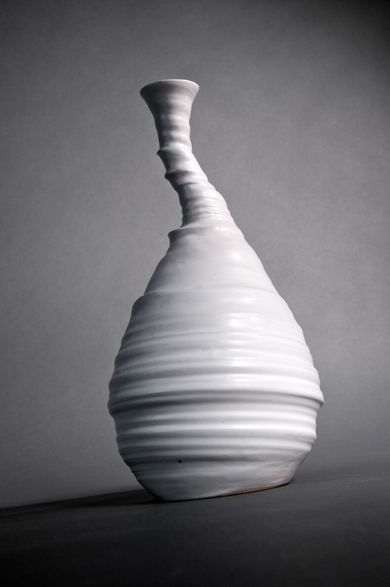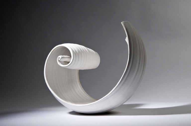 Spinning clay gives out an energy that I attempt to capture. My work consists of fluid sketches in clay with surfaces that ripple and undulate, thrown with both great physical vigour and sensitivity of touch. My aim is to achieve a harmony of balance and proportion that allows the forms to stand alone, visually centred yet subliminally, discharging swirls of energy into the surrounding, negative space. Monochrome glazes with a satin sheen reflect a range of tones as light pours over planes and edges. Surface references are also made to particular places or points in time by brushwork and painterly use of combined glazes.